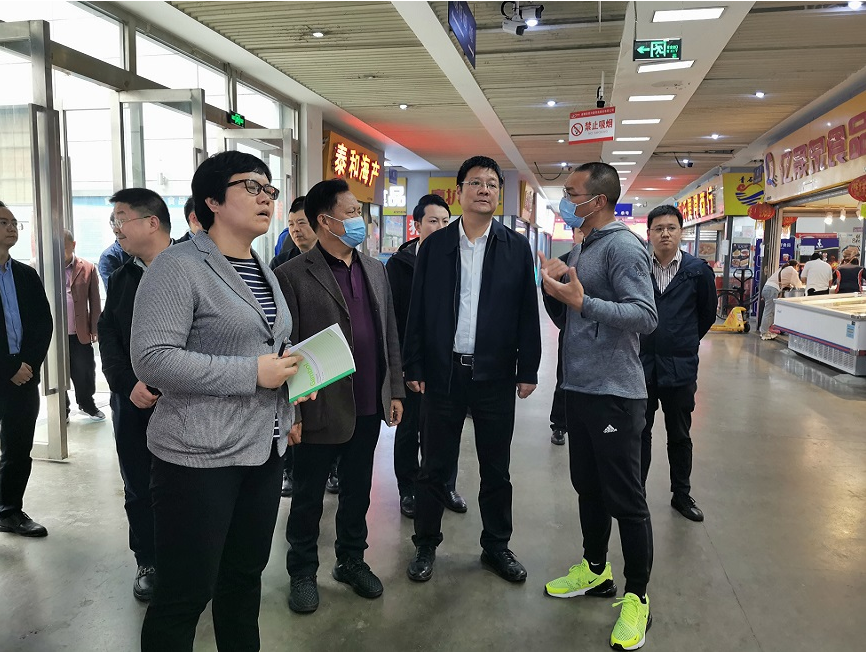 李刚副司长率调研组人员径直来到冻品交易区,由区市场监督管理局姚渡镇所长暨驻银犁疫情防控专办组组长胡德忠向调研人员介绍了银犁市场的疫情防控情况。