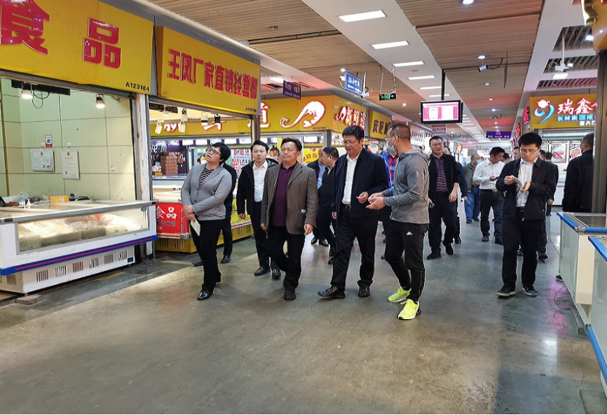 公司执行董事冯昌云陪同调研组人员巡查二楼交易区并对公司概况做一一介绍。银犁公司作为省市区重点招商引资单位入驻青白江十余年,目前整个园区占地520亩,从2013年投运以来,已建成30万吨仓储容量冻库及一栋9万平米综合交易楼,园区涵盖冻品、水产、腌腊、干杂、水发等品类,入驻商家1000余户。