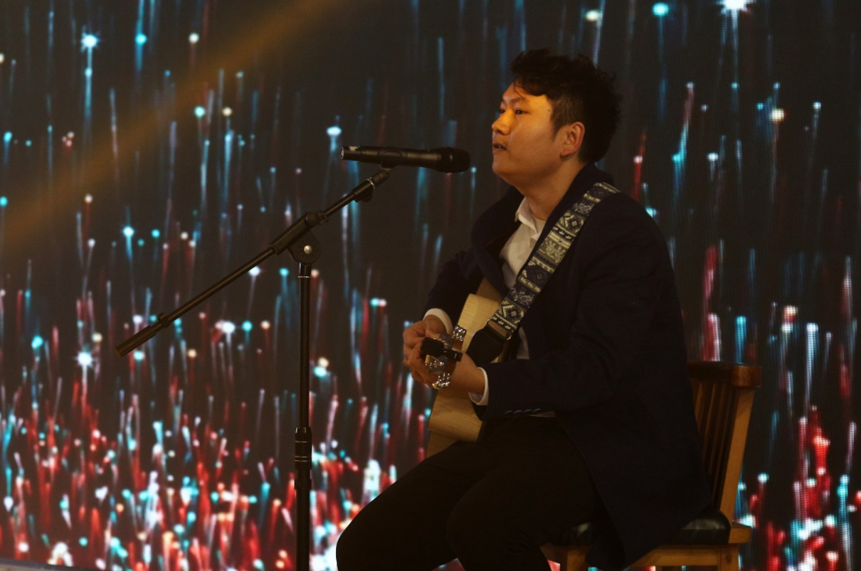 《光阴的故事》歌曲结束后,演唱者郑显峰、赵桂明和周涛邀请谢董讲述十年的创业故事。
