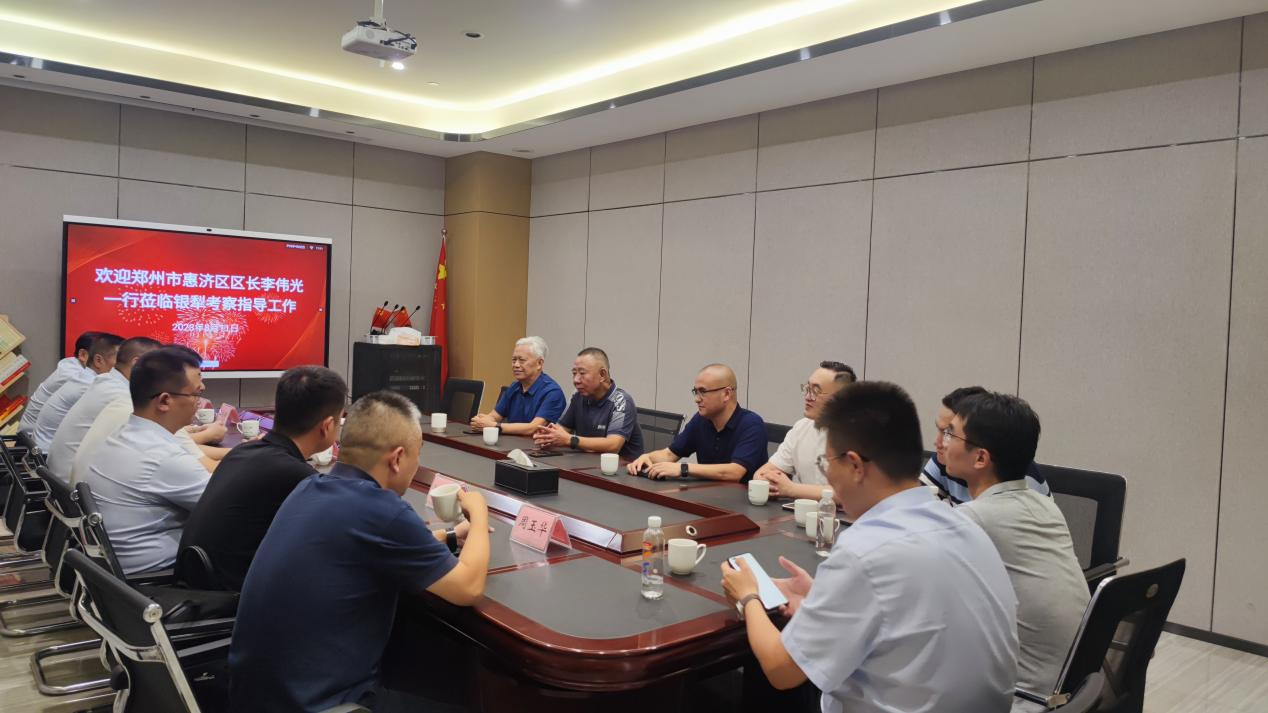 2023年8月11日,郑州市惠济区区委副书记、区长李伟光、副区长马东亮、商务局局长王浩瞻、大河路办事处主任何文龙、政府行政综合服务中心主任乔海涛、天河控股(河南)有限公司总经理周玉华等一行15人到银犁公司进行市场考察调研。